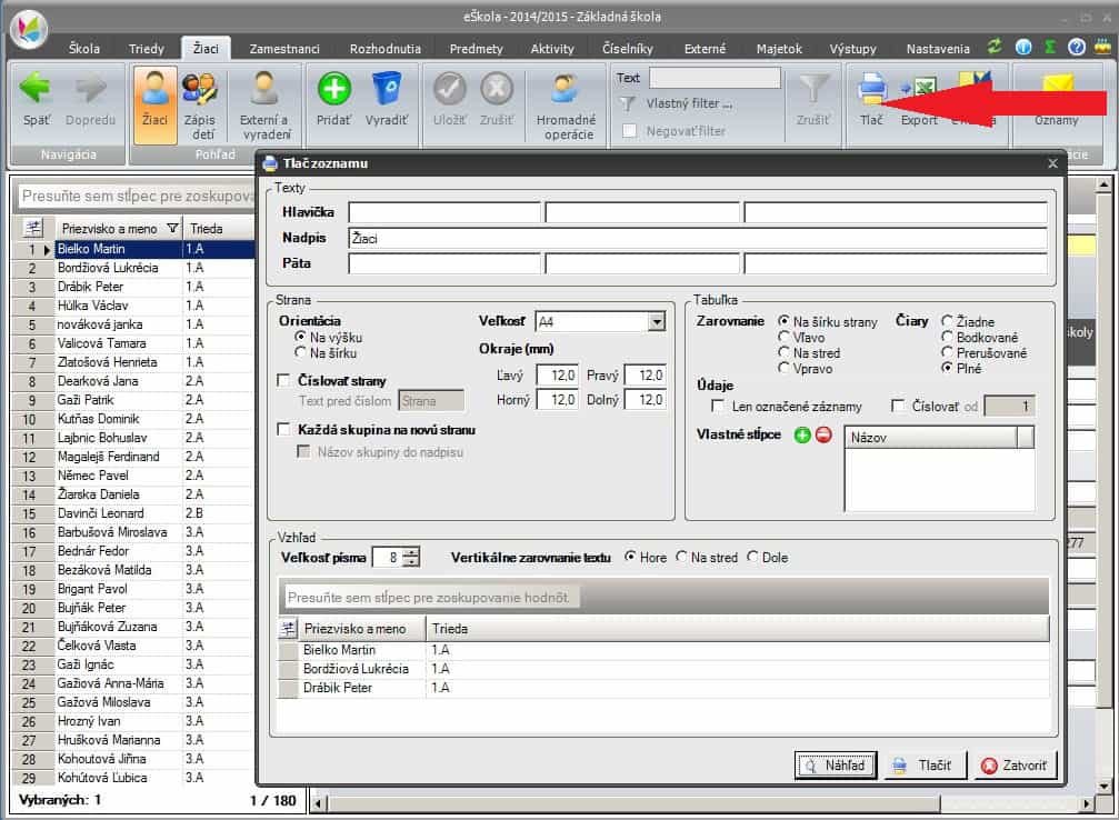 • Prepnite sa na pohľad Žiaci, kliknite na Tlač a otvorí sa okno Tlač zoznamu,